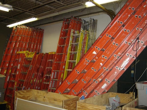 The old warehouse was piled high with ladders for paint and repair projects.